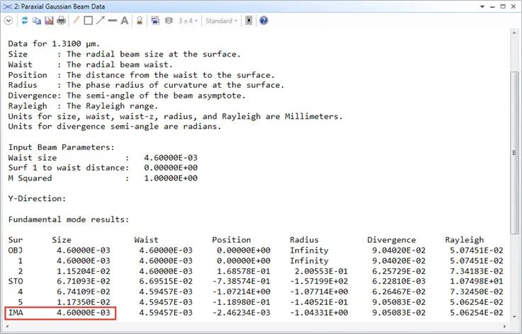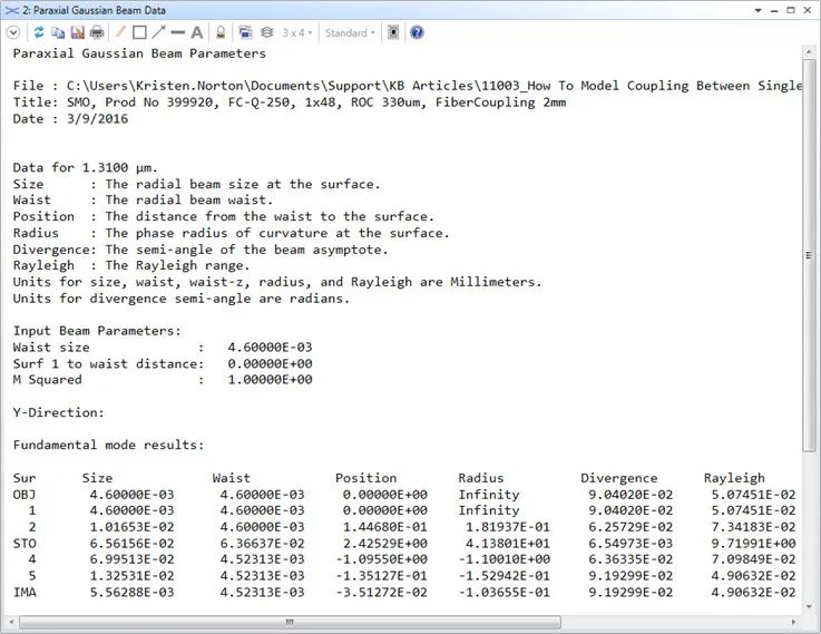 優(yōu)化光纖/透鏡距離可得到 0.117 mm 的光纖/透鏡距離值,以及以下高斯光束數(shù)據(jù)。