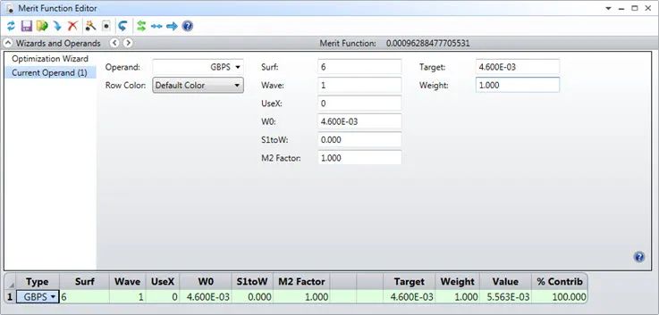 OpticStudio有一個優(yōu)化操作數(shù)GBPS,即高斯光束近軸尺寸,可用于優(yōu)化光纖和耦合透鏡之間的距離。因為我們知道系統(tǒng)在對稱的情況下效果最好,所以我們知道表面 6 處所需的高斯光束尺寸為 4.6 μm,因此評價函數(shù)是一個簡單的單行操作數(shù)。