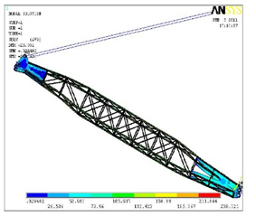 對自行式塔式起重機臂架系統(tǒng)設(shè)計仿真,通過加載計算得到系統(tǒng)的主臂、變幅撐桿、水平撐桿、拉鎖、 三腳架、塔柱在合理自重范圍內(nèi)滿足剛度強度要求。通過 Ansys 仿真得到了各個設(shè)計關(guān)鍵點的剛度強度數(shù)據(jù),校核了設(shè)計圖紙的合理性,給設(shè)計生產(chǎn)起到了提高效率的方法。