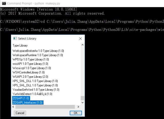 4.輸入“python makepy.py” 并按回車。當(dāng)Select Library窗口出現(xiàn)時(shí),使用Ctrl鍵同時(shí)選擇ZOSAPI與ZOSAPI_Interfaces并點(diǎn)擊OK。