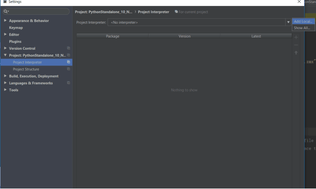 初次運(yùn)行PyCharm提示需要配置interpreter option時(shí),點(diǎn)擊File>Settings>Project:>Project interpreter,再點(diǎn)擊Add Local來添加Python。