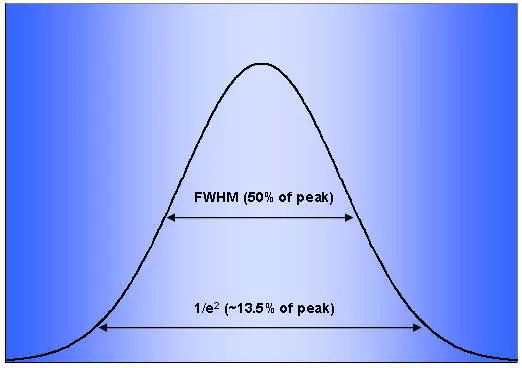 OpticStudio使用1/e^2作為半寬值來(lái)對(duì)高斯光束的光斑尺寸進(jìn)行定義,它表示能量降低至峰值能量的13.5%的位置。 然而有些供應(yīng)商提供的測(cè)試數(shù)據(jù)是以半高全寬的形式給出,而非1/e^2的寬度。下文中給出了高斯光束FWHM寬度和1/e^2寬度的對(duì)應(yīng)關(guān)系。