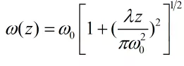 其中,w是光束在1/e^2強(qiáng)度點(diǎn)到光束中心軸的距離(半寬值),r表示以光束中心點(diǎn)為原點(diǎn)的徑向距離。寬度w與z軸位置的對(duì)應(yīng)關(guān)系可由下式表示: