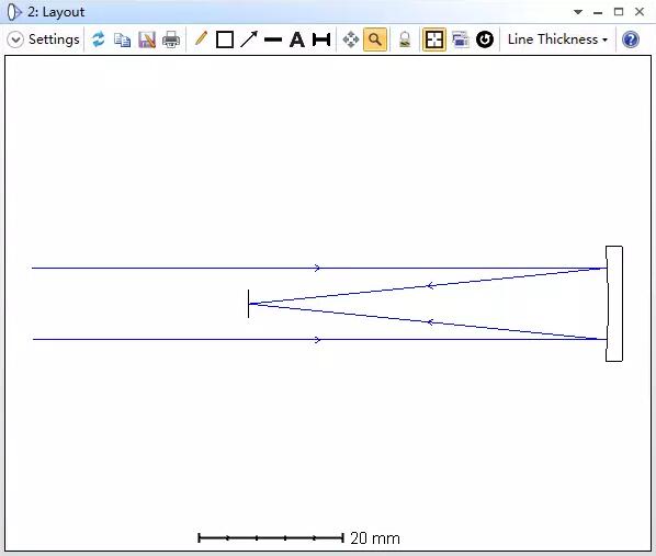 本文中使用的示例系統(tǒng)是一個焦距為50mm、F數(shù)為5的拋物面反射鏡。物體放置于無窮遠處。這是一個簡單的牛頓望遠鏡系統(tǒng),示例文件名為PSF_Newtonian.ZMX。光學系統(tǒng)如下所示: