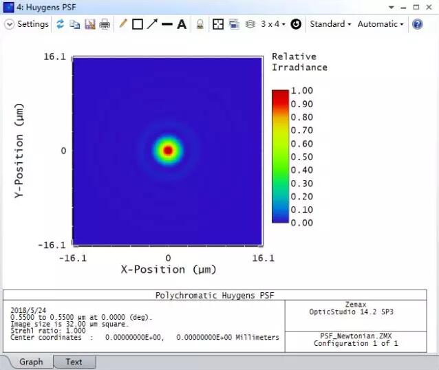 如下圖所示為示例牛頓望遠鏡系統(tǒng)軸上視場的惠更斯PSF: