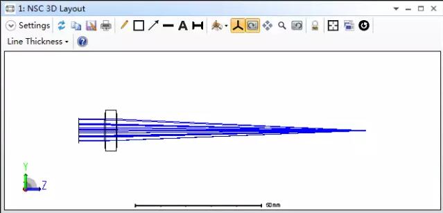 該示例文件包括一個橢圓光源、一個單透鏡和一個矩形探測器物體。光源在一個圓形區(qū)域內產生多條隨機光線。所有光線沿Z軸平行出射。光源模擬一束準直光或無窮遠的點光源。光線輸出條數(shù)設為20,分析光線的條數(shù)設為1。這將使系統(tǒng)在同一時刻只分析一條光線,我們會在后文中詳細討論。透鏡為一個簡單的單透鏡,它用來將平行光很好的聚焦在探測器上。探測器屬性設置為吸收,像素數(shù)量為120x120。