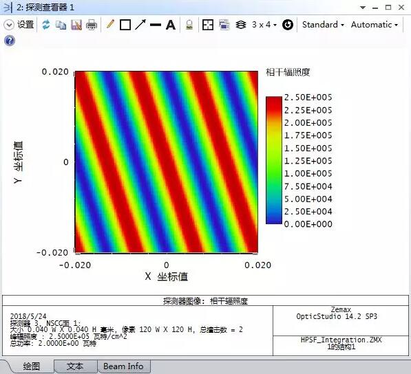 接下來讓我們通過示例觀察這一積分過程,打開示例文件HPSF_Integration,選擇分析選項卡(Analysis)- 光線追跡(Trace Rays)- 光線追跡控制(Ray Trace Control)。選中自動更新(Auto Update)。點擊“追跡(Trace)”。由于光源只定義了一根分析光線,因此一根隨機的光線被追擊并且探測器更新當前結果。再次點擊“追跡”,但注意不先點擊“清空探測器(Clear Detectors)”來追擊第二根光線。此時兩根光線的追跡結果將顯示出兩個傳播方向有一定夾角的平面波的干涉結果,探測器將顯示條紋圖案。由于光線的選取是隨機的,因此條紋圖案每次也不相同,因此探測器結果可能與下圖并不完全相同。