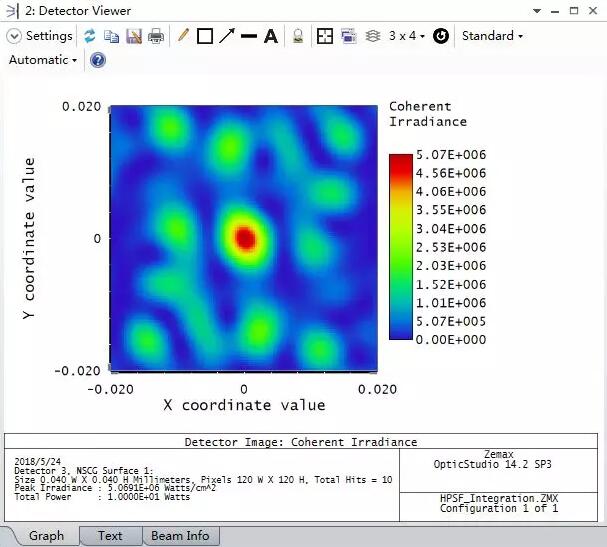 觀察積分過程的一種方法是一次觀察一根光線的相干疊加結果。這可以通過在Zemax rOpticStudio的非序列元件功能中設置相干探測器來完成。示例文件為HPSF_Integration.ZMX。