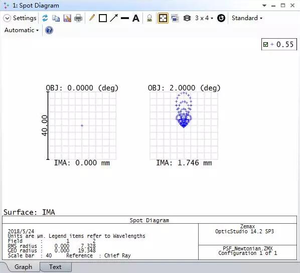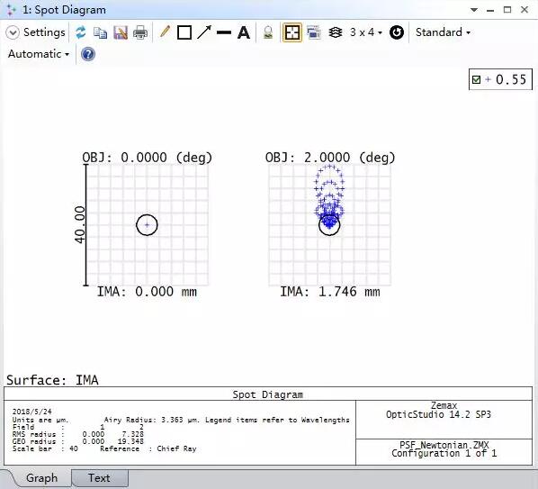注意圖中相似的艾里斑波形。牛頓望遠系統(tǒng)的軸上視場像差為零,如上圖所示這也是符合預期的結果。