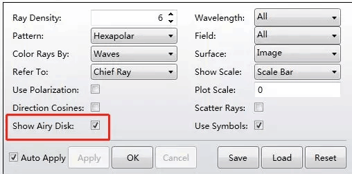將艾里斑(Airy Disk)的參考橢圓添加到點列圖中是一個快速比對幾何像差和衍射效應的方法。打開點列圖的設置列表,并勾選顯示艾里斑: