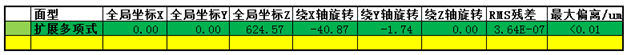 將風(fēng)擋的CAD文件導(dǎo)入到非序列模式,然后采集點云,并在序列模式下用自定義模塊進(jìn)行擬合,過程從略,注意只采集小的有效區(qū)域即可。采用擴(kuò)展多項式面型(Extended Polynomial)最高次4階對坐標(biāo)位置及面型擬合的結(jié)果如下:
