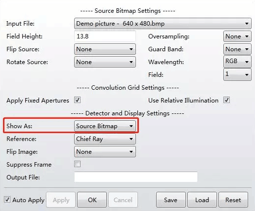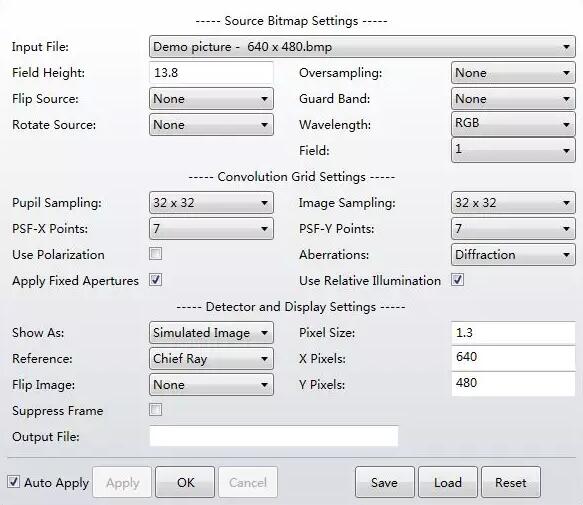 光源文件的格式可以為.bmp, .jpg, .ima或.bim。無論系統(tǒng)使用哪種視場(chǎng)定義類型,該功能會(huì)讀取文件并重新設(shè)置圖像的尺寸(雖然物高是這一功能最直接的視場(chǎng)定義方式)。輸入的圖像可以旋轉(zhuǎn)、翻轉(zhuǎn)、如需要也可以重新采樣并置于特定視場(chǎng)的中心。