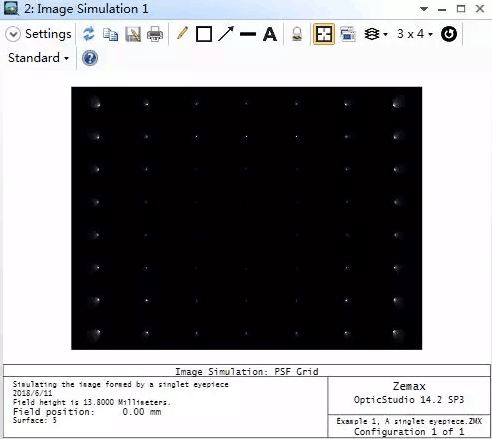 圖像模擬可以計(jì)算點(diǎn)擴(kuò)散函數(shù)網(wǎng)格。網(wǎng)格會(huì)覆蓋整個(gè)視場(chǎng),它可以描述位圖視場(chǎng)定義下的不同視場(chǎng)點(diǎn)的像差。PSF網(wǎng)格計(jì)算會(huì)考慮偏振和相對(duì)照度的影響。探測(cè)器顯示設(shè)置如下圖所示: