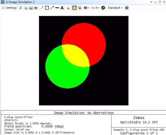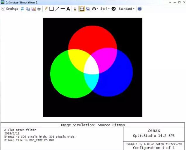 OpticStudio同樣可以考慮光學(xué)系統(tǒng)的偏振效應(yīng)對(duì)成像的影響。在這個(gè)示例中,一個(gè)包含相互重疊的紅綠藍(lán)三色圓斑的圖像作為光源,如下圖所示: