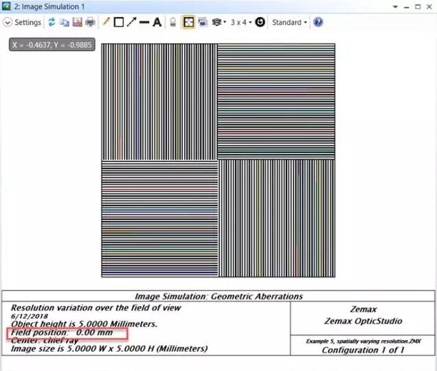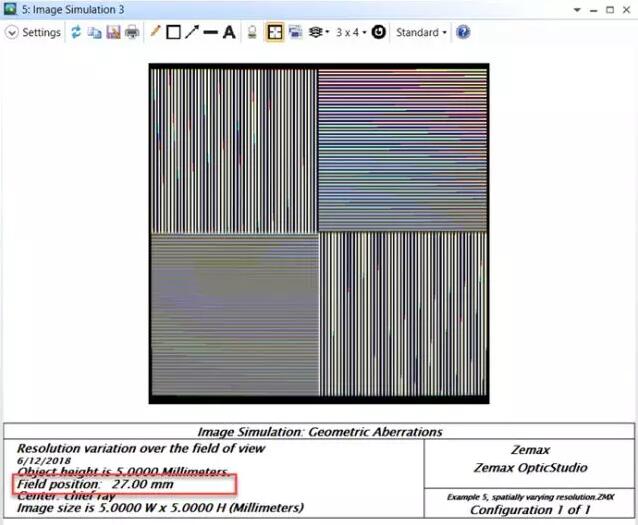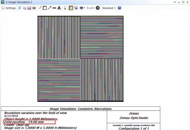 我們可以清晰的看到隨著視場(chǎng)角的增大,子午方向和弧矢方向的對(duì)比度(MTF)差異逐漸變大以及垂軸色差變得顯著。同樣要注意,該窗口需要最大化或至少顯示像素分辨率大于輸入圖像(201x201個(gè)像素)。