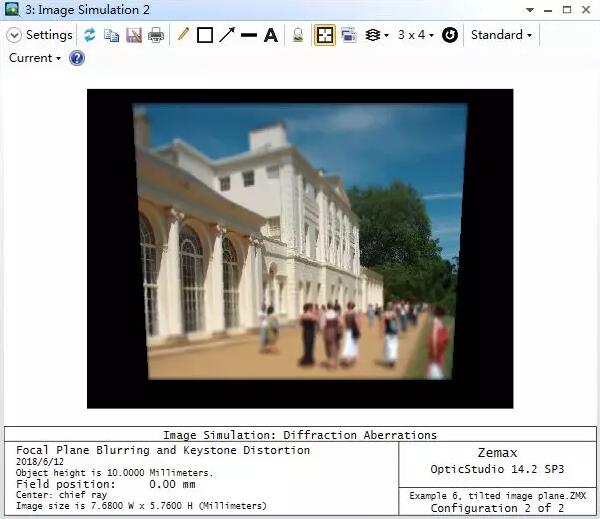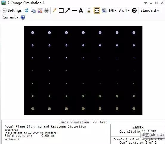 在這一示例中,物面和像面均設(shè)為傾斜來引入梯形畸變和焦平面模糊。在組態(tài)1中,系統(tǒng)沒有傾斜的面,并且在整個(gè)視場(chǎng)下的成像質(zhì)量都接近衍射極限。在組態(tài)2中(快捷鍵ctrl+A快速切換組態(tài)),物像面傾斜導(dǎo)致光學(xué)系統(tǒng)在上下邊緣視場(chǎng)的成像質(zhì)量遠(yuǎn)未達(dá)到衍射極限: