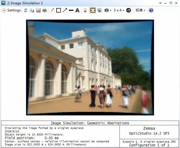 這是該功能一個(gè)經(jīng)典的使用實(shí)例。這個(gè)透鏡是一個(gè)目鏡,但需要注意的是這不是一個(gè)無焦系統(tǒng):其成像聚焦在-1000mm處(提供了1光焦度的調(diào)節(jié)量)。雖然成虛像,但這是一個(gè)聚焦系統(tǒng)。由于系統(tǒng)像差過大,因此相對(duì)照度無法進(jìn)行計(jì)算。在本例中,相對(duì)照度設(shè)為所有視場(chǎng)點(diǎn)照度均勻分布。注意仿真圖下方的文字表述。