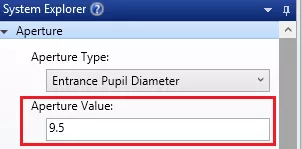現(xiàn)在請(qǐng)打開Zemax OpticStudio,設(shè)定 “系統(tǒng)選項(xiàng)(System Explorer) > 孔徑 (Aperture) > 孔徑值(Aperture Value)” 為9.5,