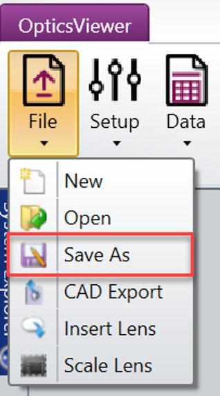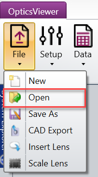 要加載 .ZMX 或 .ZAR 文件,請(qǐng)?jiān)贠pticsViewer選項(xiàng)卡...文件 (File)下拉菜單中點(diǎn)擊打開(kāi)(Open), 并選擇要打開(kāi)的文件。