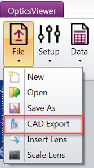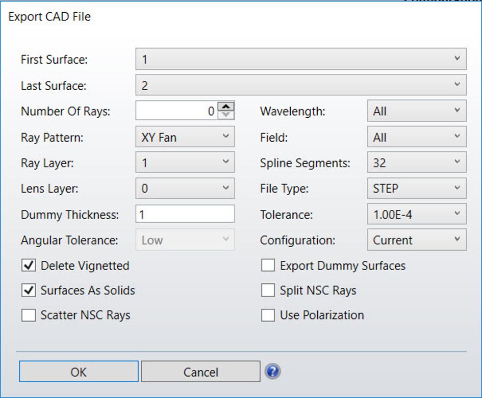 更多關(guān)于導(dǎo)出CAD文件窗口的設(shè)置,請(qǐng)參閱幫助手冊(cè):The OpticsViewer Tab > File drop-down > CAD Files。