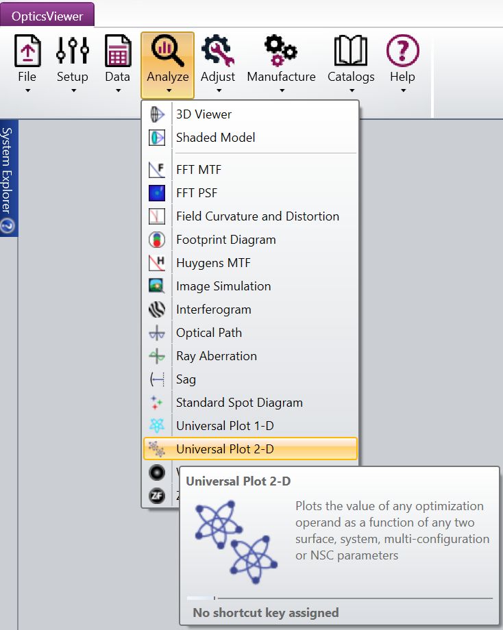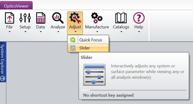 用戶能夠通過OpticsViewer研究某個參數(shù)的改變對系統(tǒng)光學(xué)性能的影響。最適合的工具是滑塊工具和通用繪圖工具。