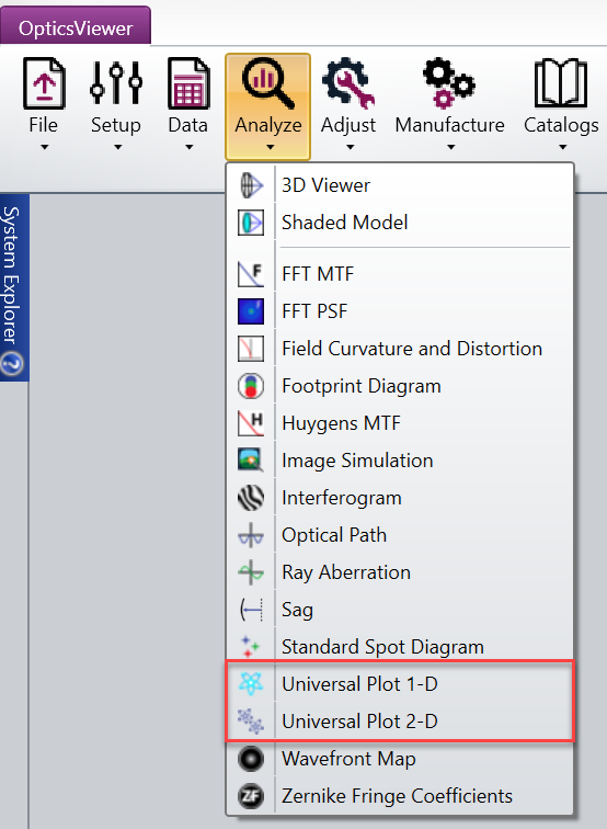 在分析...通用繪圖工具1-維 & 2-維(Analyze...Universal Plot 1-D & Universal Plot 2-D)中找到通用繪圖工具。 分析窗口提供的圖形或文本數(shù)據(jù)都是根據(jù)鏡頭數(shù)據(jù)編輯器(Lens Data Editor)中輸入的鏡頭系統(tǒng)數(shù)據(jù)計(jì)算得出的。分析窗口不改變鏡頭數(shù)據(jù),只提供鏡頭系統(tǒng)性能各方面的評估信息。