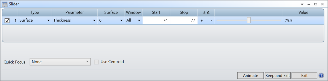 點(diǎn)擊動畫觀看光斑尺寸如何隨著表面6厚度的調(diào)整而改變。在選項(xiàng)框右擊選擇插入滑塊輕松添加更多參數(shù)。