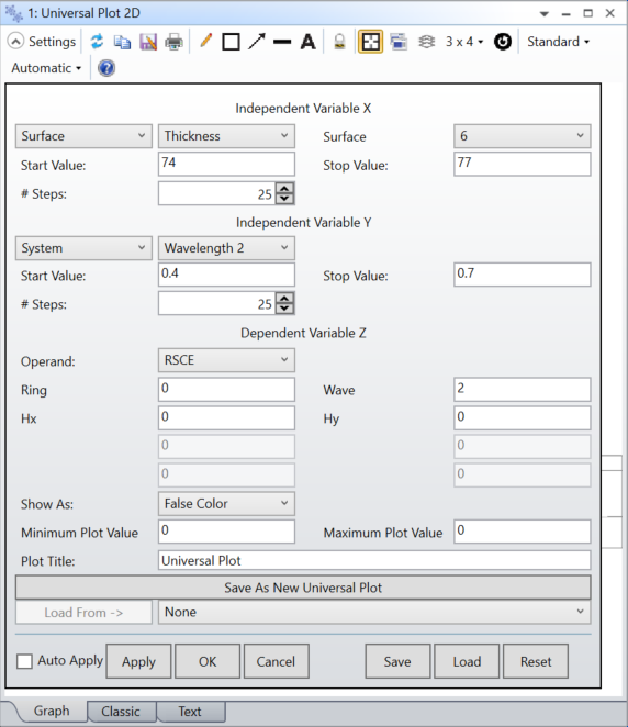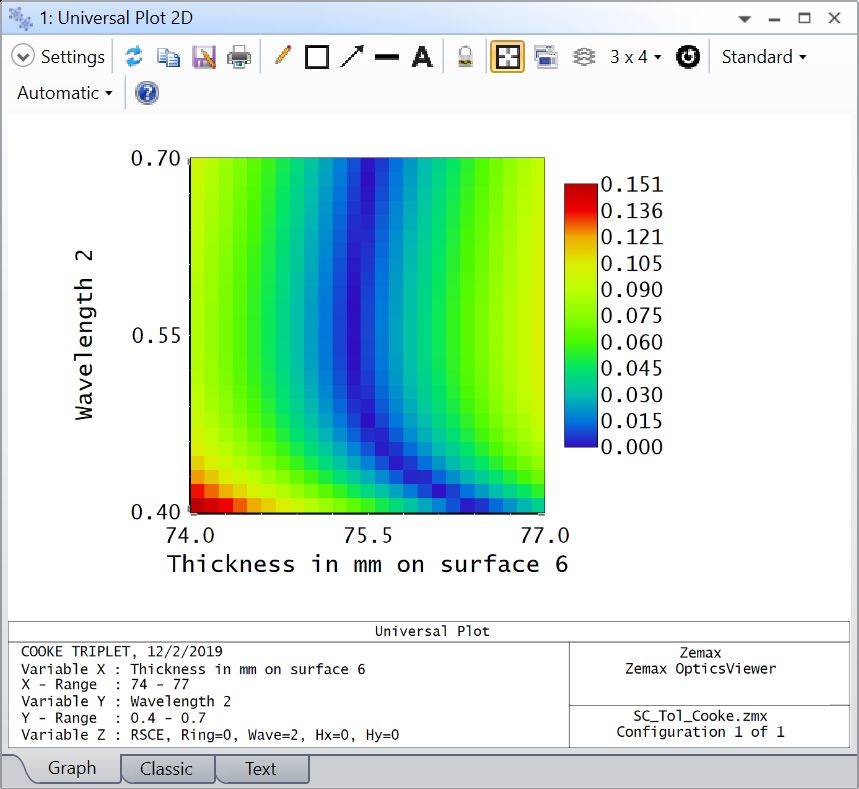 打開設(shè)置(Settings)菜單,獨(dú)立變量X改為表面6的厚度,變化范圍 74 mm - 77 mm,步長數(shù)為25。對于獨(dú)立變量Y ,先把第一個選項(xiàng)框由表面改為系統(tǒng),然后選擇波長2。設(shè)置波長范圍為0.4 um – 0.7 um,步長數(shù)為25。最后設(shè)置獨(dú)立變量Z為操作數(shù)RSCE,相對于光斑質(zhì)心的 RMS光斑半徑。設(shè)置為操作數(shù)RSCE后,將Wave設(shè)置為2,來對應(yīng)上面的Y變量,波長2。