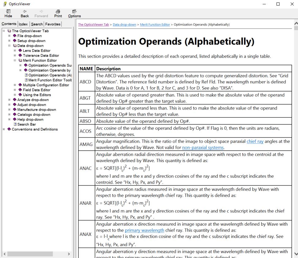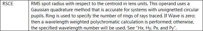有關(guān)操作數(shù)RSCE的詳細(xì)信息,以及OpticsViewer/OpticStudio中可以使用的所有操作數(shù),請參閱幫助手冊的如下章節(jié):OpticsViewer Tab > Data drop-down > Merit Function Editor > Optimization Operands (Alphabetically)。