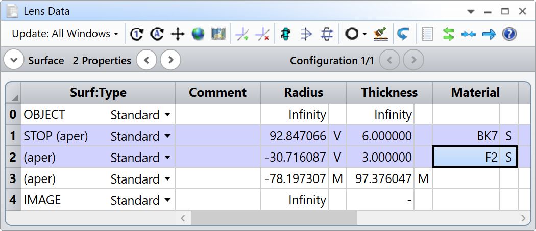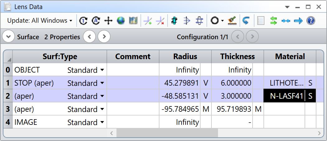 在大約一分鐘之后停止優(yōu)化。LDE 中的玻璃可能如下所示: