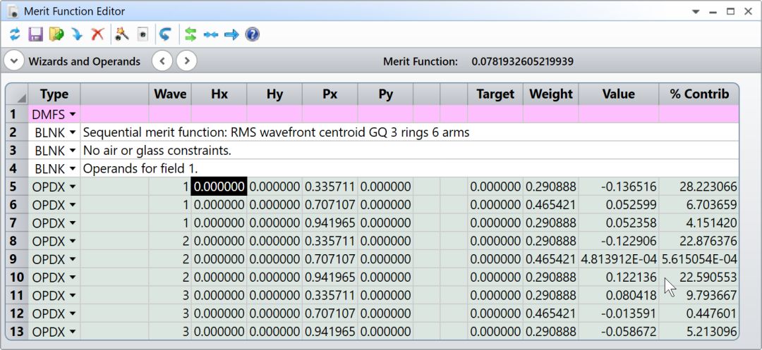 使用評價函數(shù)編輯器中的默認評價函數(shù)工具構建 RMS 波前優(yōu)化默認評價函數(shù)。