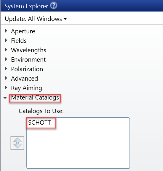 替換的玻璃選自系統(tǒng)當前使用的玻璃目錄。在“System Explorer...Material Catalogs...Catalogs To Use”中可進行設置,本例使用的是 Schott 目錄。