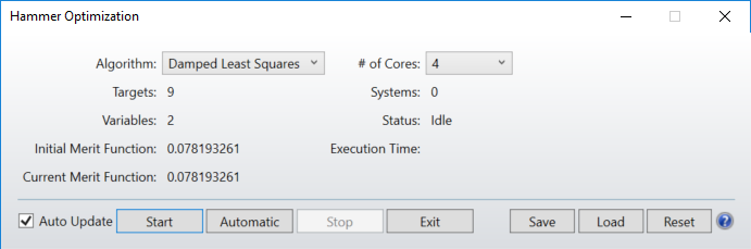 點擊“Optimize...Hammer Current”執(zhí)行 Hammer 優(yōu)化。勾選“Auto Update”選項,查看優(yōu)化期間 LDE 的數(shù)據(jù)和 OPD 光扇圖的變化。
