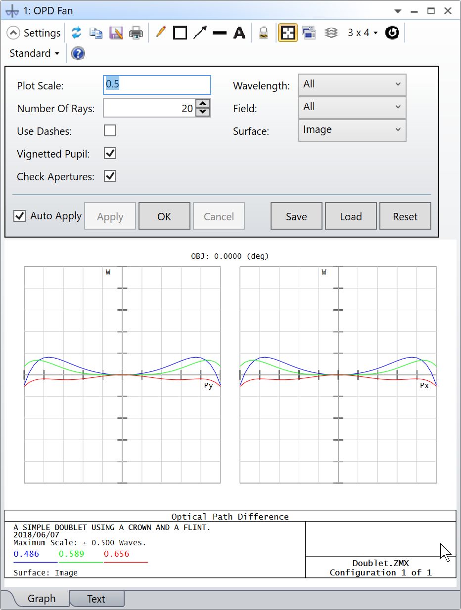 打開 OPD 光扇圖,觀察系統(tǒng)在優(yōu)化之前的性能。OPD 最大量度為 0.5 個波長。