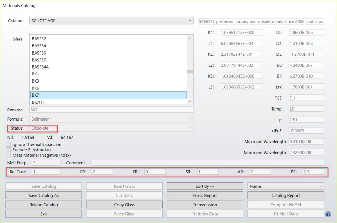 玻璃替換模板使用玻璃目錄中的“相對價格 (Relative cost)”和“狀態(tài) (Status)”等數(shù)據(jù)來篩選玻璃。例如,勾選“首選 (Preferred)”選項通常十分有用,因為首選 (Preferred) 的玻璃通常是熔煉更頻繁的玻璃,更可能根據(jù)需求被供應商提供。