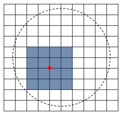 接著,我們利用下圖將上述概念推廣到二維空間。我們先以二維網(wǎng)格的矢高值表示目標的表面結構,并選擇其中一點進行矢高的優(yōu)化(圖中紅點),可以看到只有藍色方形(5x5個點)內(nèi)的區(qū)域會受到影響。