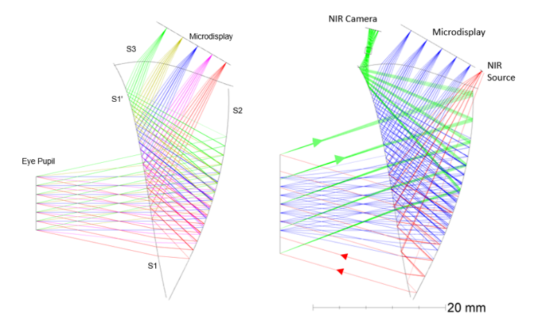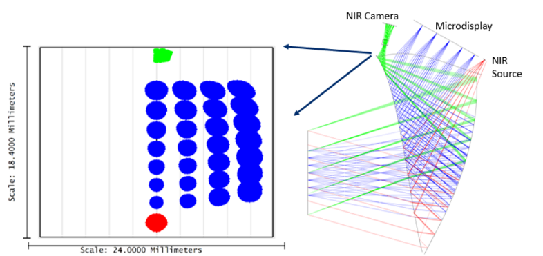 注意,在下圖中我們可以看到NIR光束在S3上產(chǎn)生成像路徑的光跡(footprint, 綠色區(qū)域)和微顯示器上的光線(藍色區(qū)域)是明顯分離的。