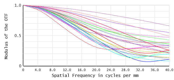 而NIR人眼追跡系統(tǒng)經(jīng)過優(yōu)化后,成像的表現(xiàn)有了顯著的提升。系統(tǒng)的像散在各視場有了幾個數(shù)量級的改善(如850 nm處由1.38個波縮小為0.0509個波)。而此系統(tǒng)的MTF表現(xiàn)也有明顯的提升(在 40 lp/mm時,平均視場為0.45),使用者可以看見清晰的像。這樣的結果使我們可以準確的接收使用者瞳孔的NIR反射,并據(jù)此來幫助在軟件中投射影像的優(yōu)化。