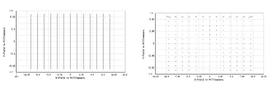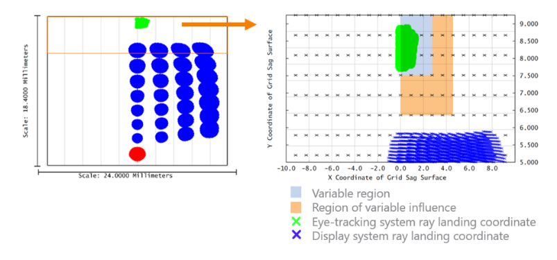 上圖中為網(wǎng)格矢高的數(shù)據(jù)信息。右圖中,所有的數(shù)據(jù)點均以黑色的”x”表示。我們可以看到淺藍色、且大小為4x4的范圍代表了變量區(qū)。在前面的篇幅中曾提到,雙三次樣條的內(nèi)差演算法將變量影響的范圍向外擴增兩點,也就是圖中的橘色區(qū)域。確認了網(wǎng)格的密度和變量區(qū)域后,我們可以肯定光學表面的信息會被限制在微顯示器的成像范圍內(nèi),意即微顯示系統(tǒng)的表現(xiàn)將在優(yōu)化的過程被保留。