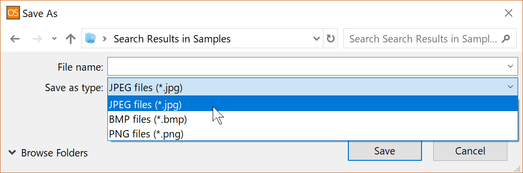 導(dǎo)出格式選項(xiàng)為 PNG、BMP 和 JPG。選擇其中任一格式將調(diào)用 Windows“另存為”窗口,您可以在其中以所需的名稱(chēng)保存文件到所需的目錄。