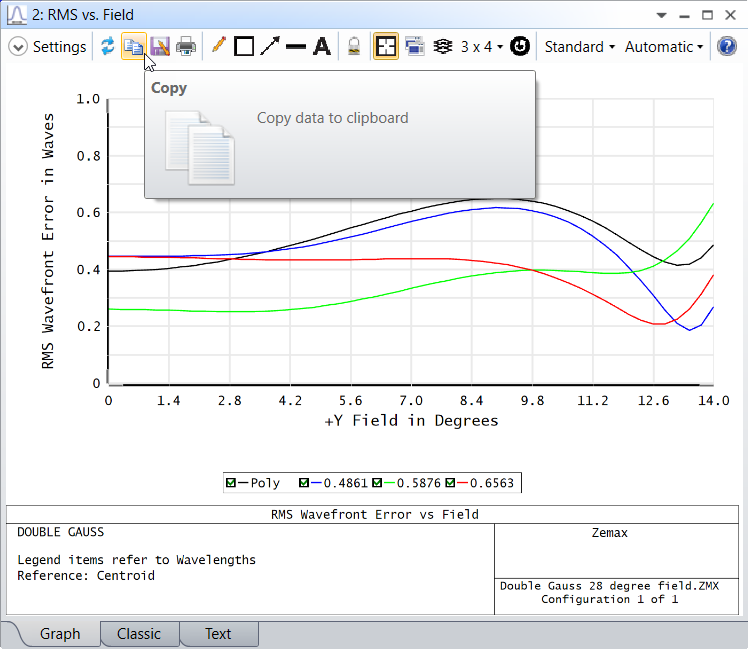 一個(gè)極其有用的 Windows 功能是剪貼板。剪貼板是圖表和文本的“等候區(qū)”。使用剪貼板的好處是幾乎所有 Windows 程序都可以導(dǎo)入或?qū)С龅郊糍N板。要使 OpticStudio 圖表進(jìn)入剪貼板,您可以右鍵點(diǎn)擊圖像并選擇“復(fù)制圖片”。分析窗口的工具欄中也包含“復(fù)制”功能:
