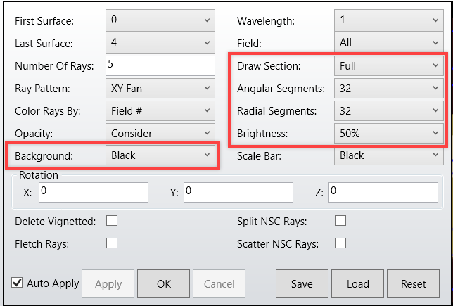 實(shí)體模型和 NSC 實(shí)體模型具有許多其他設(shè)置,可用于更改示意圖的外觀。對(duì)于序列系統(tǒng)的實(shí)體模型,有用于剖面繪圖、徑向段數(shù)、角向段數(shù)、亮度、背景和透明度的設(shè)置。