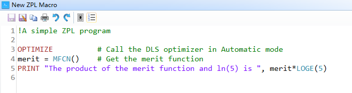 ZPL類似于一個腳本將這幾個組成部分包在一起。作為演示,想像您需要優(yōu)化一個鏡頭,計算鏡頭的優(yōu)化函數(shù)值,并將該值乘以5的對數(shù)。則相應的ZPL即如下所示: