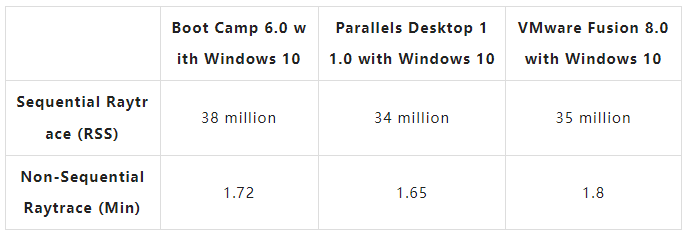 如前文所述,雙系統(tǒng)和虛擬機(jī)是在Mac上運(yùn)行Windows的兩種不同方法,因此會(huì)帶來OpticStudio的性能差異。為此,我們分別用Macbook Air(Intel I5 1.4 GHz,2 GB內(nèi)存)測(cè)試了三種方法(雖然沒有做其他Windows系統(tǒng)筆記本電腦的對(duì)照組,但其性能表現(xiàn)應(yīng)當(dāng)與Boot Camp方法的結(jié)果相當(dāng))。 兩個(gè)性能測(cè)試模擬了在序列模式和非序列模式下光線追跡的速度,下表總結(jié)了測(cè)試的結(jié)果,每個(gè)數(shù)據(jù)都是四次測(cè)試的平均值。 序列模式光線追跡采用的是設(shè)置…診斷組…性能 (Setup...Diagnostics...Performance)功能,利用根目錄下 “Samples\Sequential\Objectives\Double Gauss 28 degree field” 文件,對(duì)比每秒光線曲面數(shù)(RSS),值越大表示性能越好。 非序列模式光線追跡采用的是分析…光線追跡組…光線追跡 (Analyze…Trace Rays…Ray Trace)功能,利用根目錄下 “Samples\Non-sequential\Geometry Creation\Boolean Example 3-a diffractive scattering Boolean object” 文件,對(duì)比光線追跡時(shí)間,值越小表示性能越好。