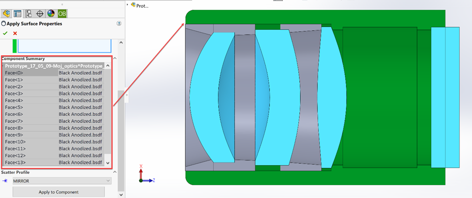 在導入完成后,工程師可以查看完整的光學模型和幾何結構,光學管理器(Optics Manager)中將列出相關的光學元件。如果在 Prepare for OpticsBuilder 工具中未勾選 只讀?(Read-only?),光機工程師也可對其進行編輯: