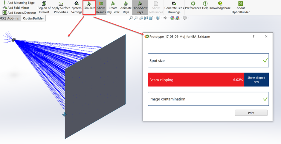 由于保留了 OpticStudio 文件中的設置,我們可以使用 仿真(Simulate)按鈕,直接在 OpticsBuilder 中執(zhí)行與 OpticStudio 中相同的光線追跡。這使得光機工程師能夠產(chǎn)生關于外殼整體設計的一些想法: