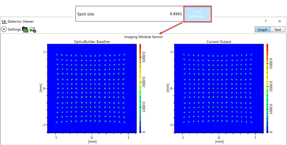 因此,有了這些機械元件,我們系統(tǒng)的主要變化是在光束遮擋方面。在該模型中,光斑尺寸可報告整個探測器性能的變化,即意味著它根據(jù)衍射光柵創(chuàng)建的點陣列來報告光斑尺寸,而這和現(xiàn)在的情況不太相關。像面污染可測量到達探測器的多余光線,這仍然相關并且保持在我們準備 OB 的初始步驟中定義的允許增量范圍內。通過單擊 “光斑尺寸(Spot size)”區(qū)域,然后單擊 顯示探測器…(Show Detectors…),可以查看在添加機械元件之前和之后的探測器結果: