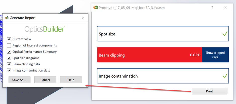 此外,還可以通過 “打印(Print)” 按鈕生成 OpticsBuilder 報告來查看這些結果:
