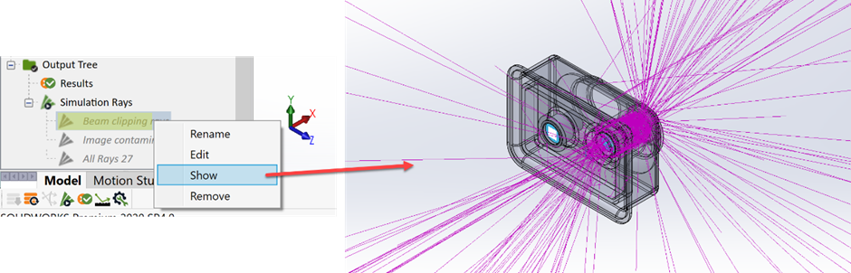 為了進一步研究,OpticsBuilder會根據(jù)光線是否污染探測器或是否被新的幾何結構遮擋來保存光線。通過右鍵點擊相應的光線集,我們可以顯示被遮擋的光線,同時定義要隱藏的其它光線集(“像面污染(Image contamination)”和“所有光線(All Rays)”):