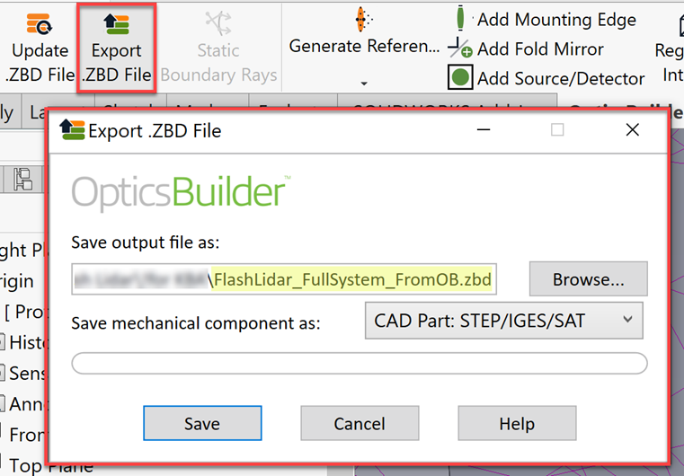 如果需要將此設計迭代發(fā)送給光學工程師進行進一步審核,光機工程師可以從OpticsBuilder導出.ZBD文件,以便在OpticsBuilder選項卡中輕松實現(xiàn)CAD程序和OpticStudio之間的文件傳輸。工程師可以選擇將部件保存為所用CAD程序的原生元件,但請注意,這需要光學工程師擁有Premium OpticStudio許可證,并可以訪問相同的CAD軟件。此外,用戶還可以選擇將元件保存為靜態(tài)STEP/IGES/SAT文件: